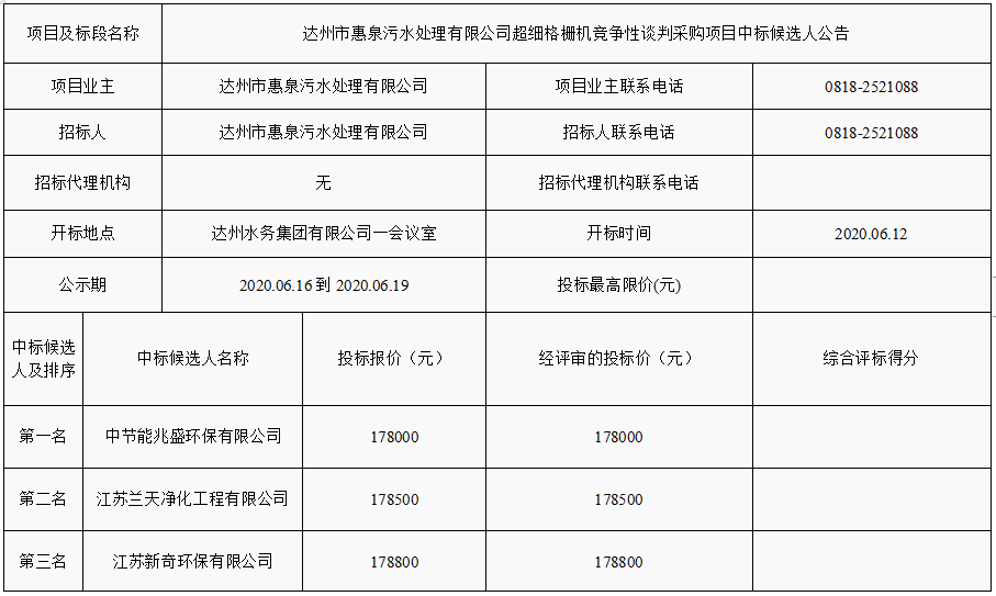 標題:達州市惠泉污水處理有限公司超細格柵機競爭性談判采購項目中標候選人公告